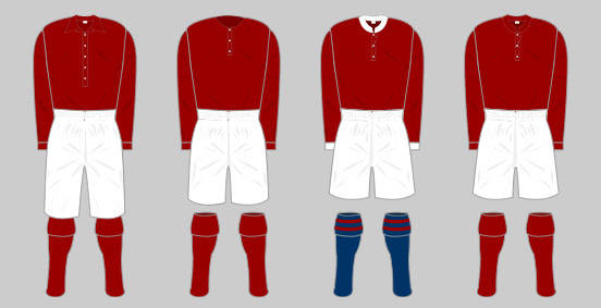 Working to a tight budget, the Club decided the most inexpensive way of acquiring a strip was to kit out the team in the same colour as the ex-Forest players. This original kit comprised a dark red shirt with long sleeves, a collar and three buttons down the front. The shirt was worn with white knee length shorts and heavy woollen socks with blue and white hoops. The goalkeeper wore the same attire apart from the shirt, which was a hand knitted cream woollen polo neck jumper.