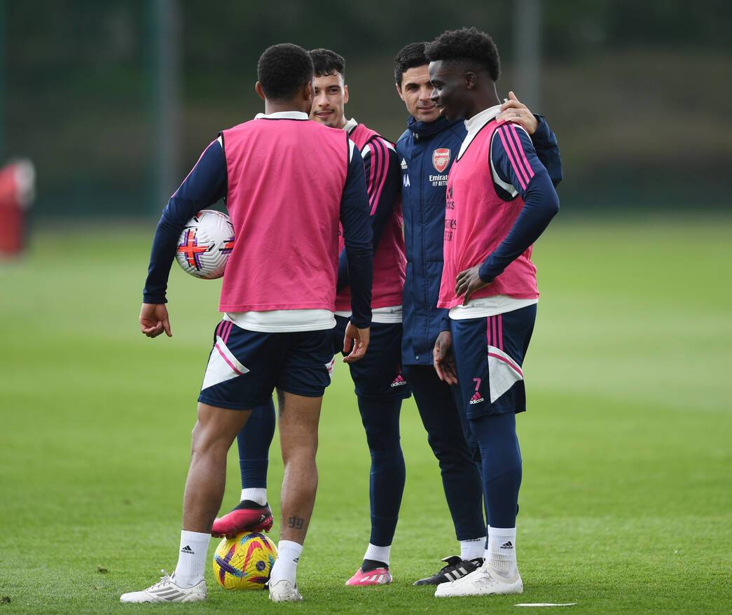 Mikel Arteta, Bukayo Saka and Gabriel Martinelli in training