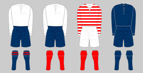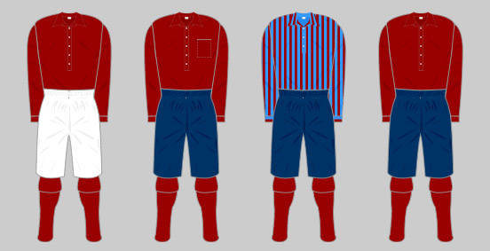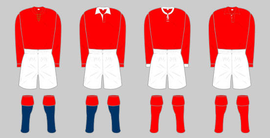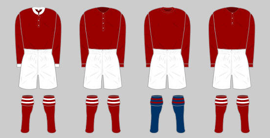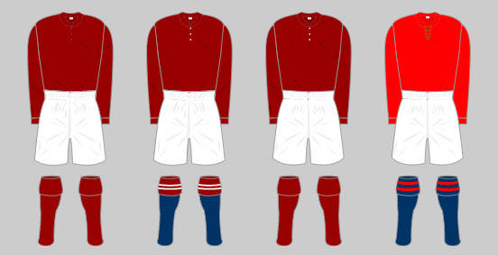 Working to a tight budget, the Club decided the most inexpensive way of acquiring a strip was to kit out the team in the same colour as the ex-Forest players. This original kit comprised a dark red shirt with long sleeves, a collar and three buttons down the front. The shirt was worn with white knee length shorts and heavy woollen socks with blue and white hoops. The goalkeeper wore the same attire apart from the shirt, which was a hand knitted cream woollen polo neck jumper.