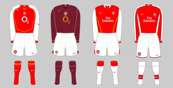 Two years later and 'O2' replaced the games company before 'Fly Emirates' took up the sponsorship in 2006. A deal which will last for eight years. In the 2005/06 season, to commemorate the Club's final campaign at Highbury, the home of Arsenal since 1913, the Gunners wore a special 'redcurrant' shirt. Designed to honour the colour of the Club's set of shirts for the first season at Highbury, they were adorned with gold lettering and accompanied by white shorts and redcurrant socks.